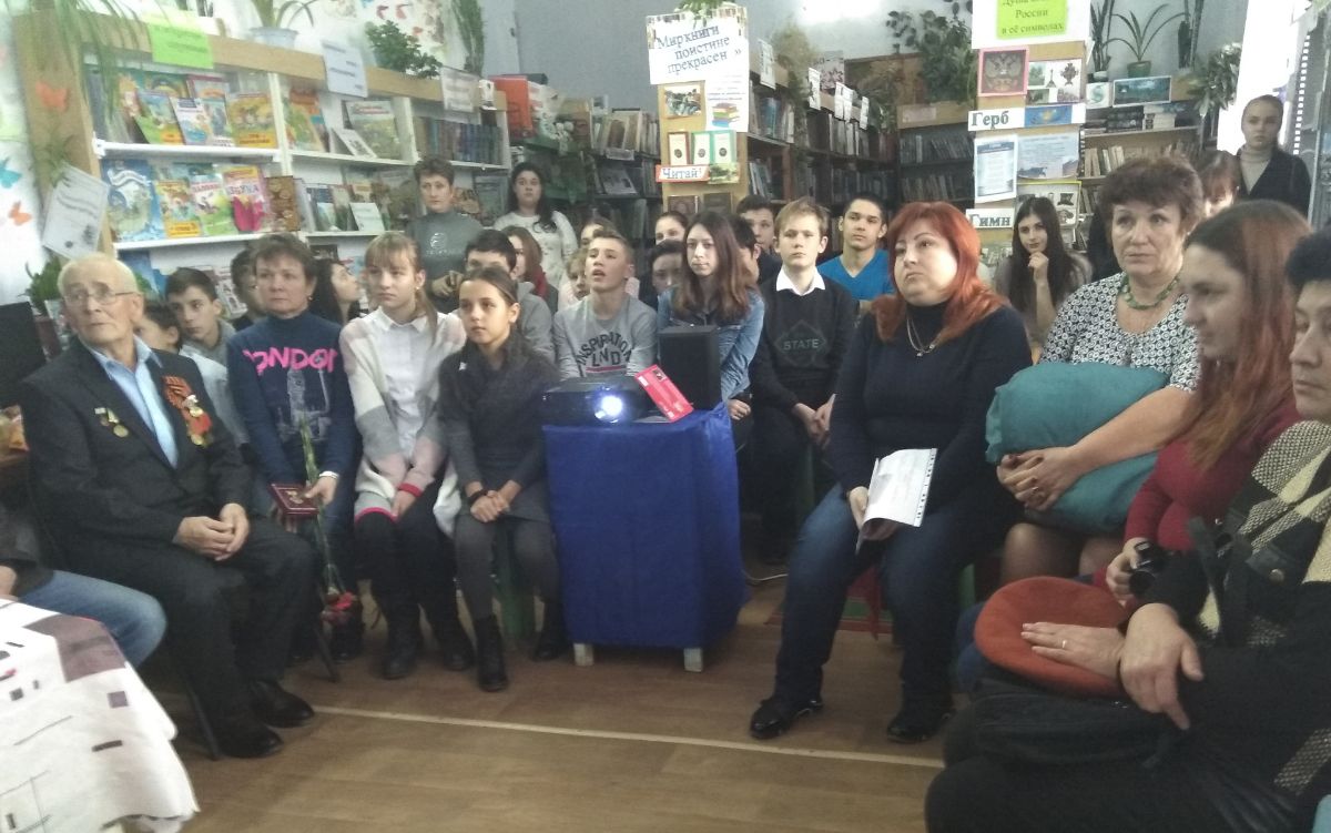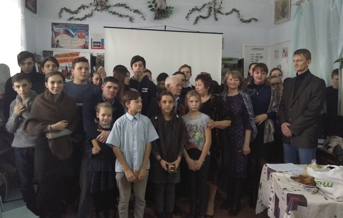 Вячеслав Каржинов вручил Александру Александровичу Савельеву памятный знак в честь 75-летия полного освобождения Ленинграда от имени правительства Санкт-Петербурга. Волнение и слёзы не позволили Александру Александровичу поделиться воспоминаниями тех страшных дней. Победительница Всероссийского конкурса юных талантов «Синяя птица», пятиклассница Катя Прокофьева подарила всем песню «Над Россией моей». Под звуки метронома присутствующие почтили память героев блокадного Ленинграда минутой молчания.